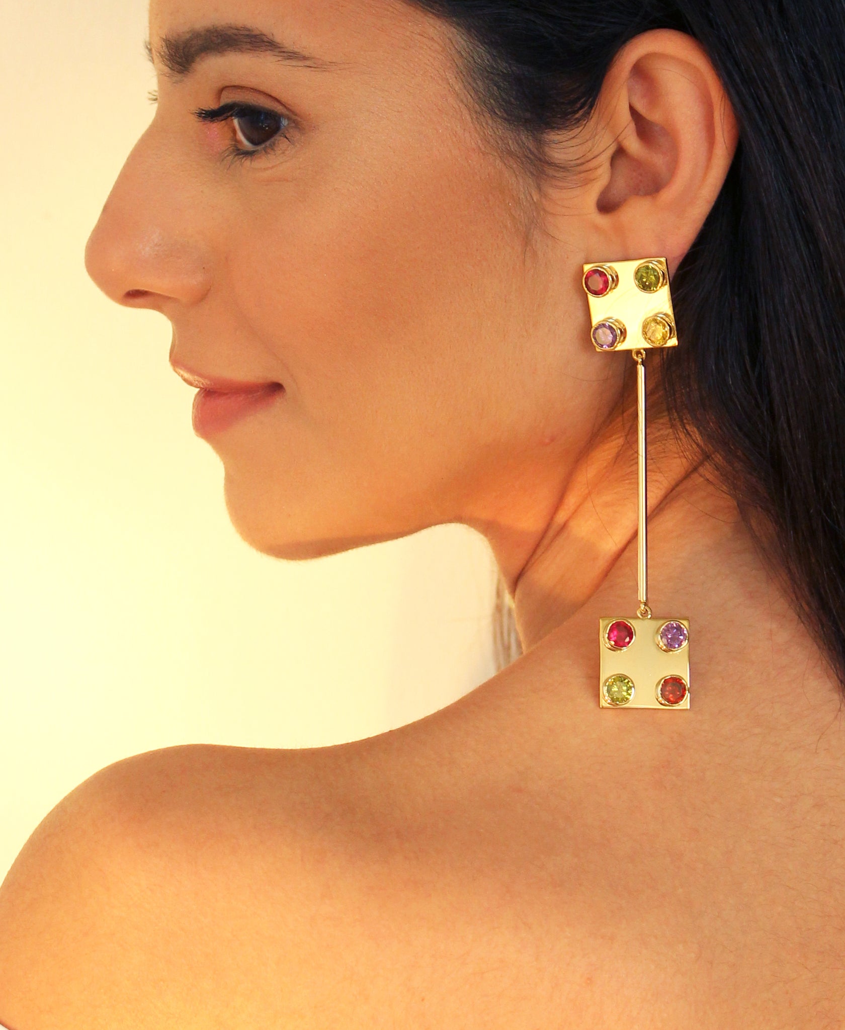 double-square, long drop earrings. 18 carat gold-plated Copper with glossy mirror finish.