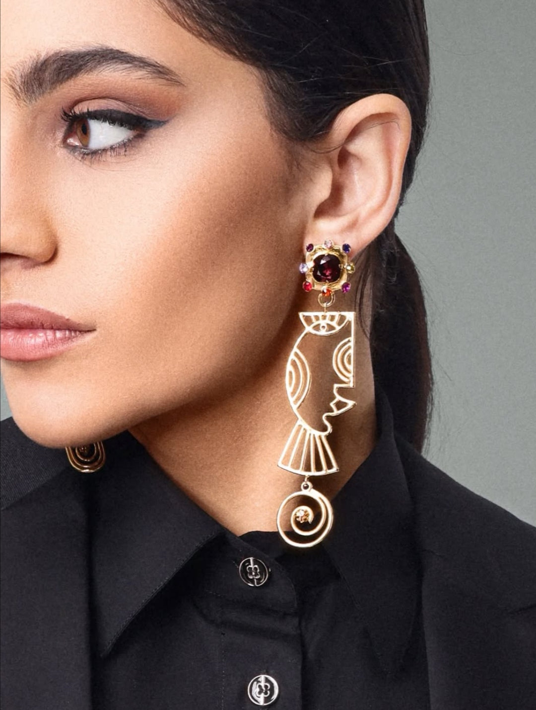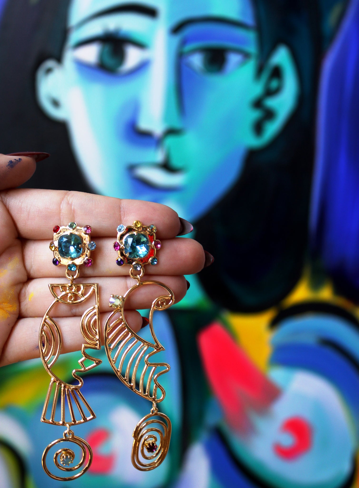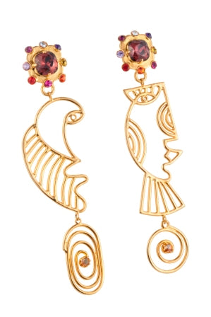 18 carats gold-plated Copper, drop earring. Cubist faces.