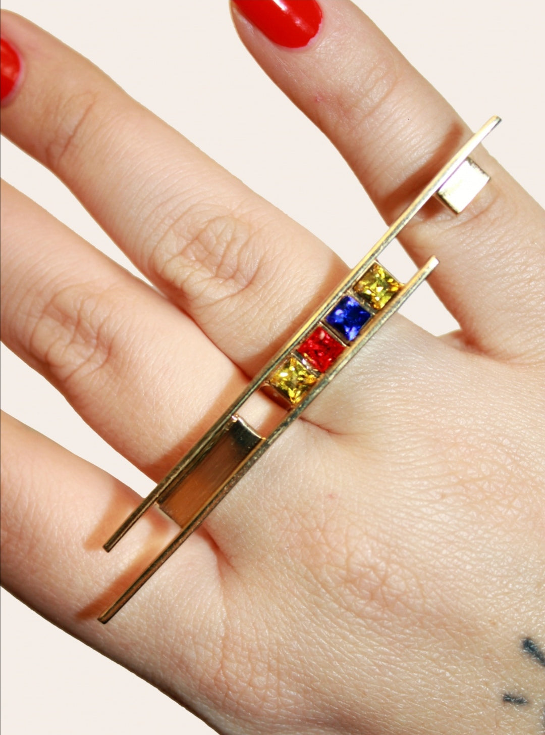 A bold rhythm of parallel lines, sparked by red, blue, and yellow Swarovski crystals.
