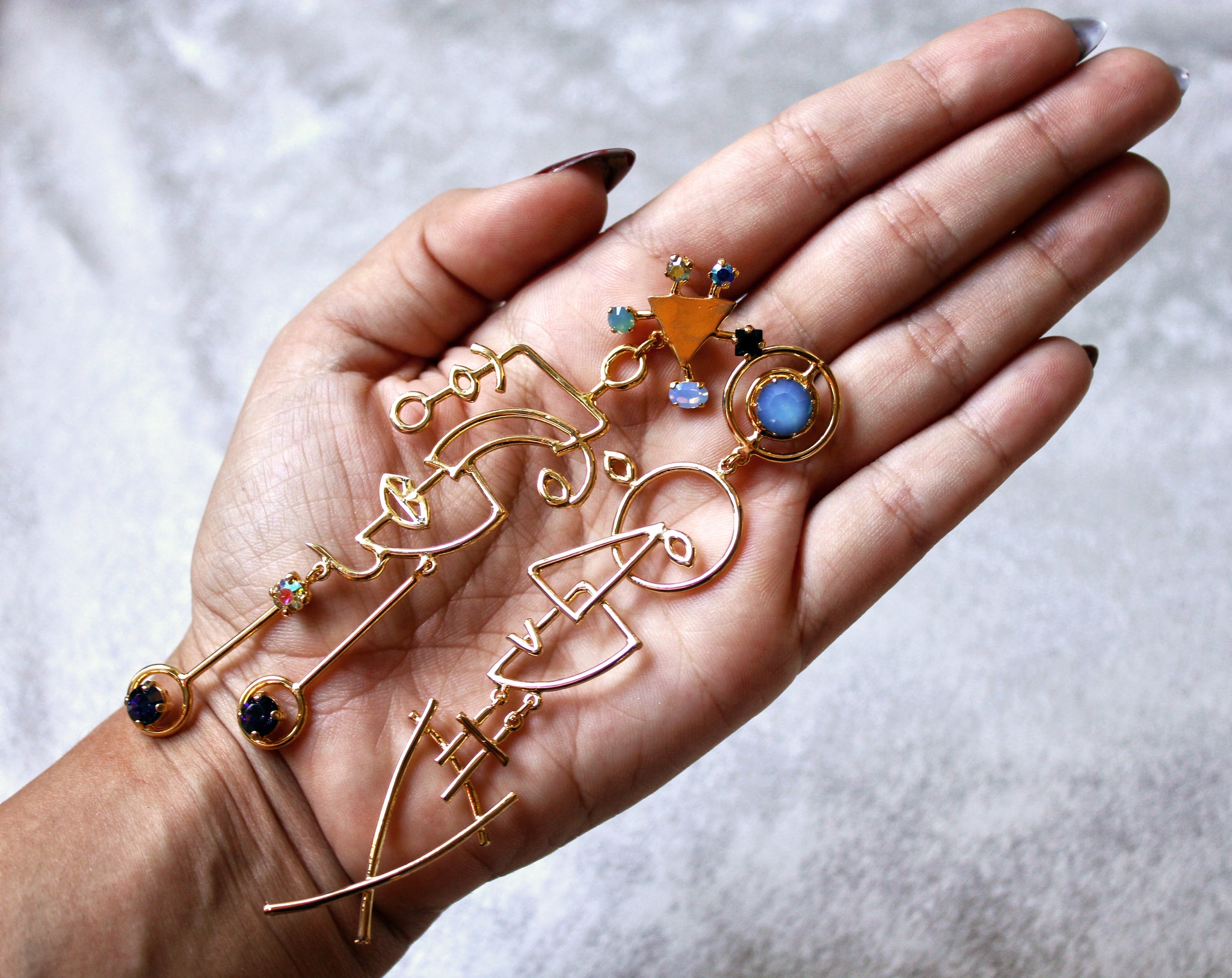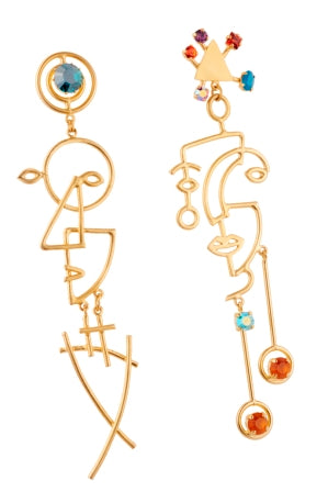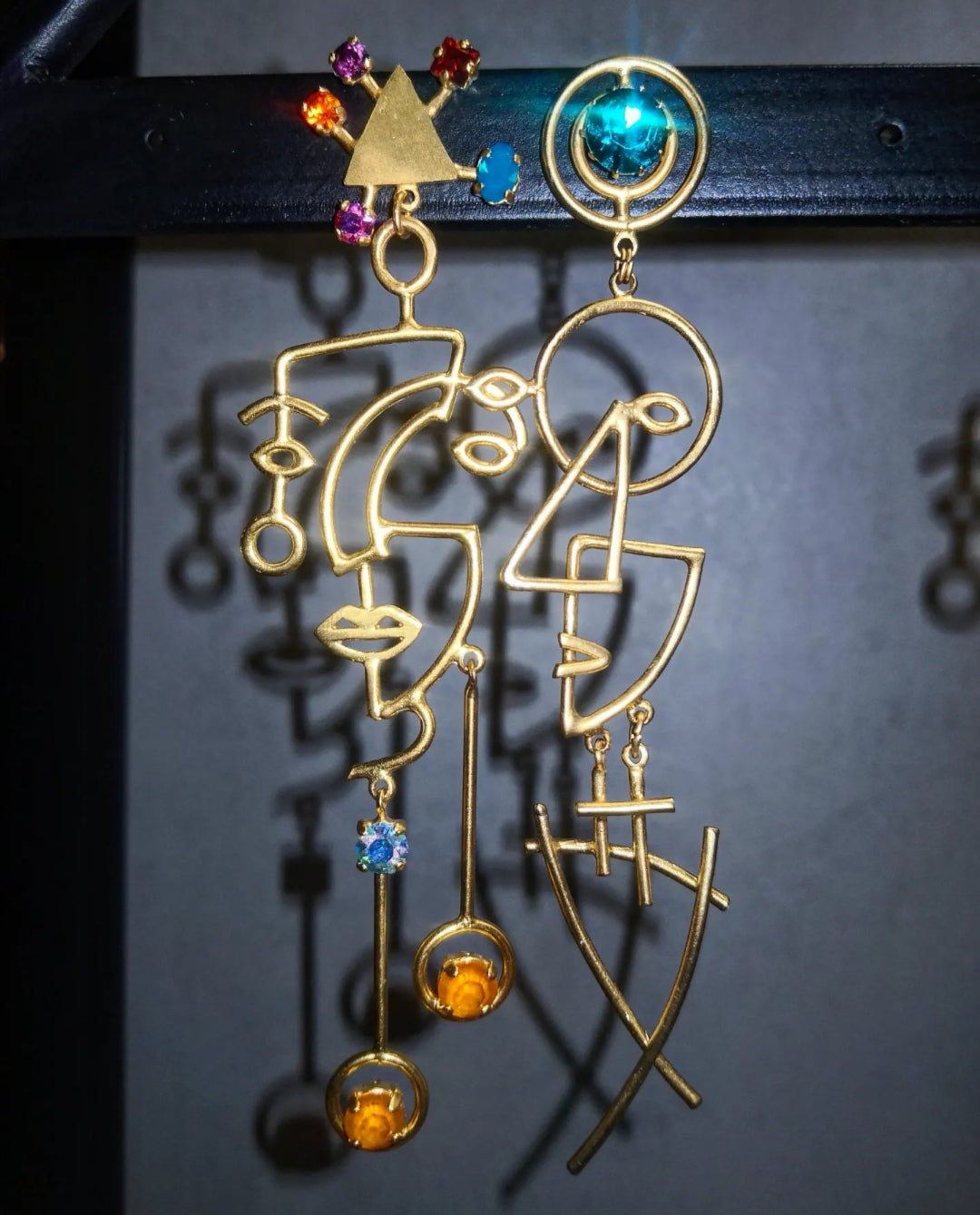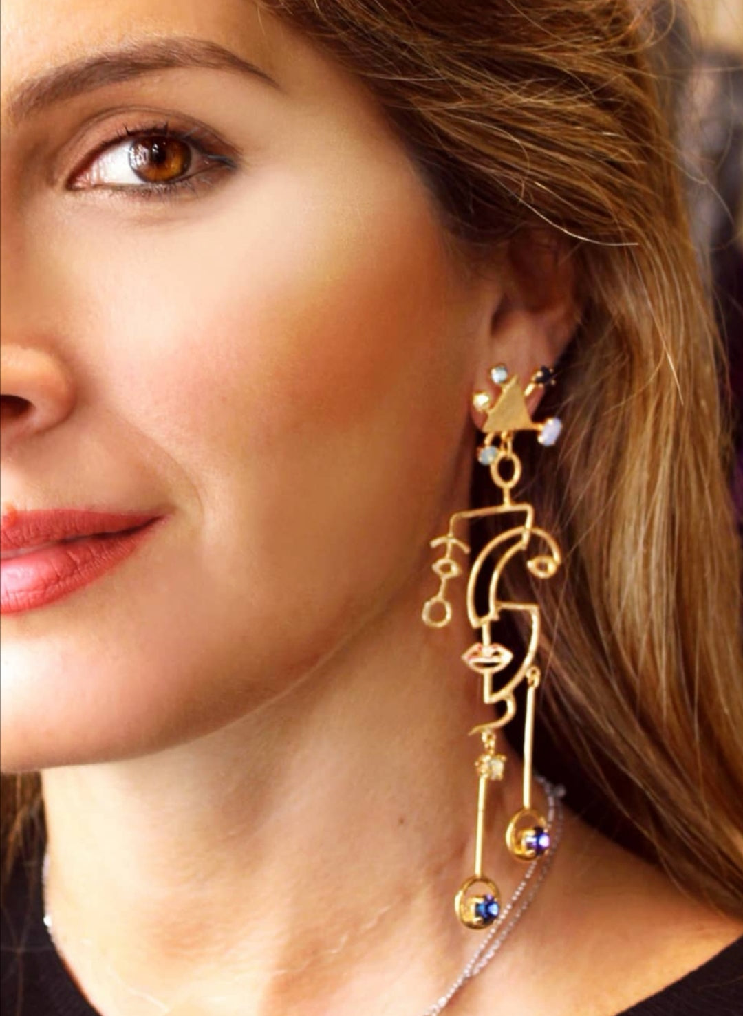 18 carats Gold-plated, long drop earring. Cubist faces.