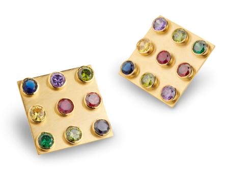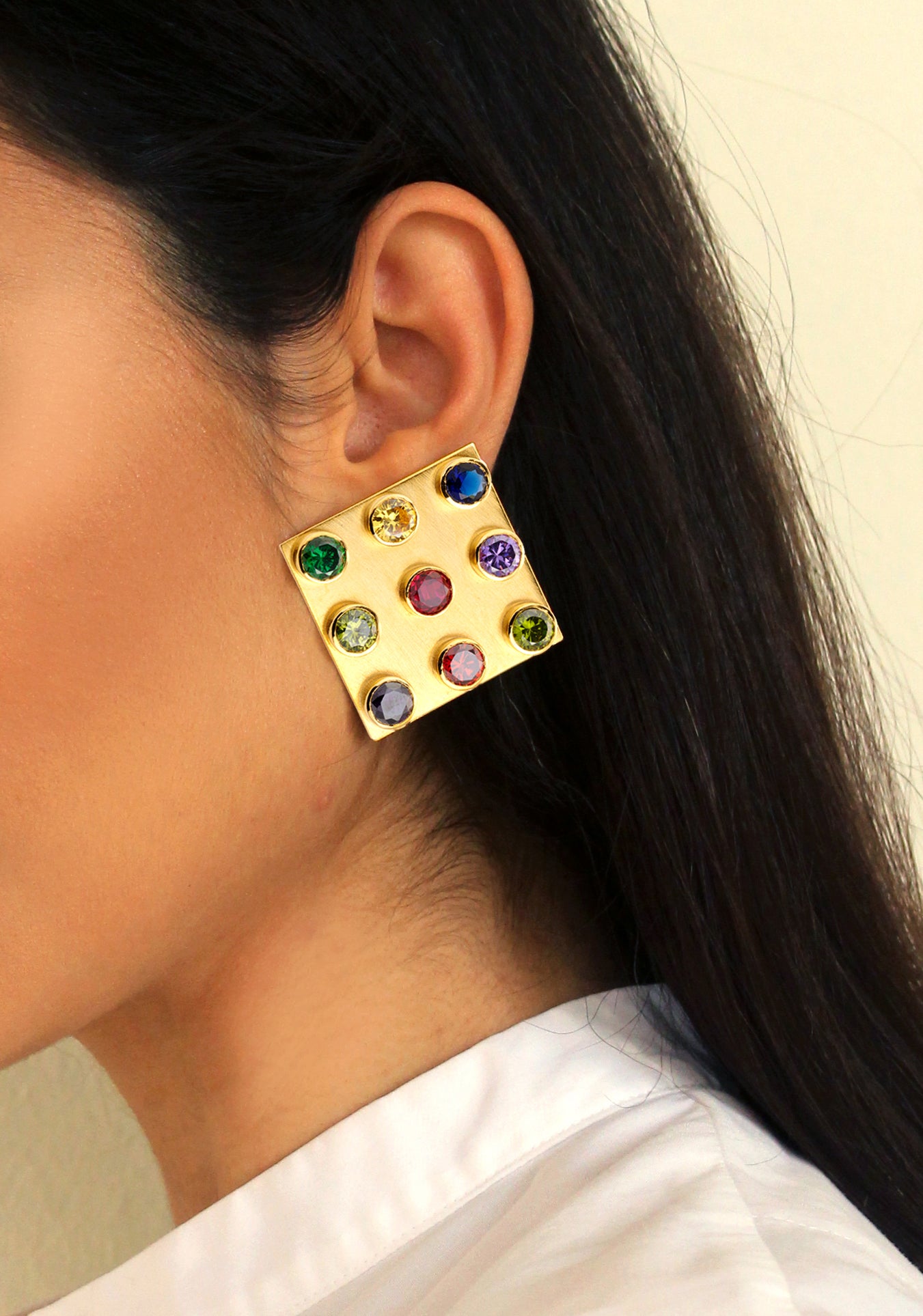 Square-shaped statement earrings. 18 carats gold-plated Copper, brushed vintage finish.