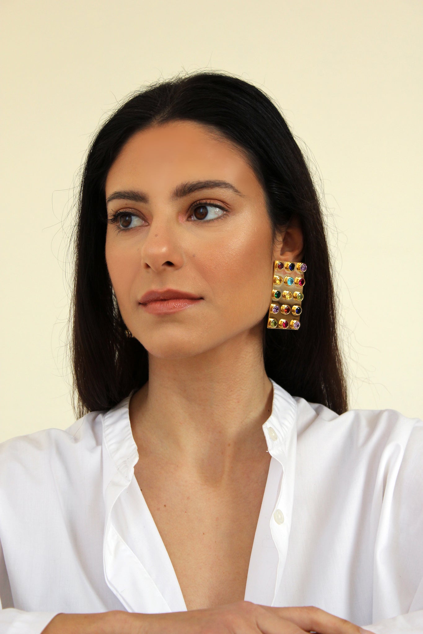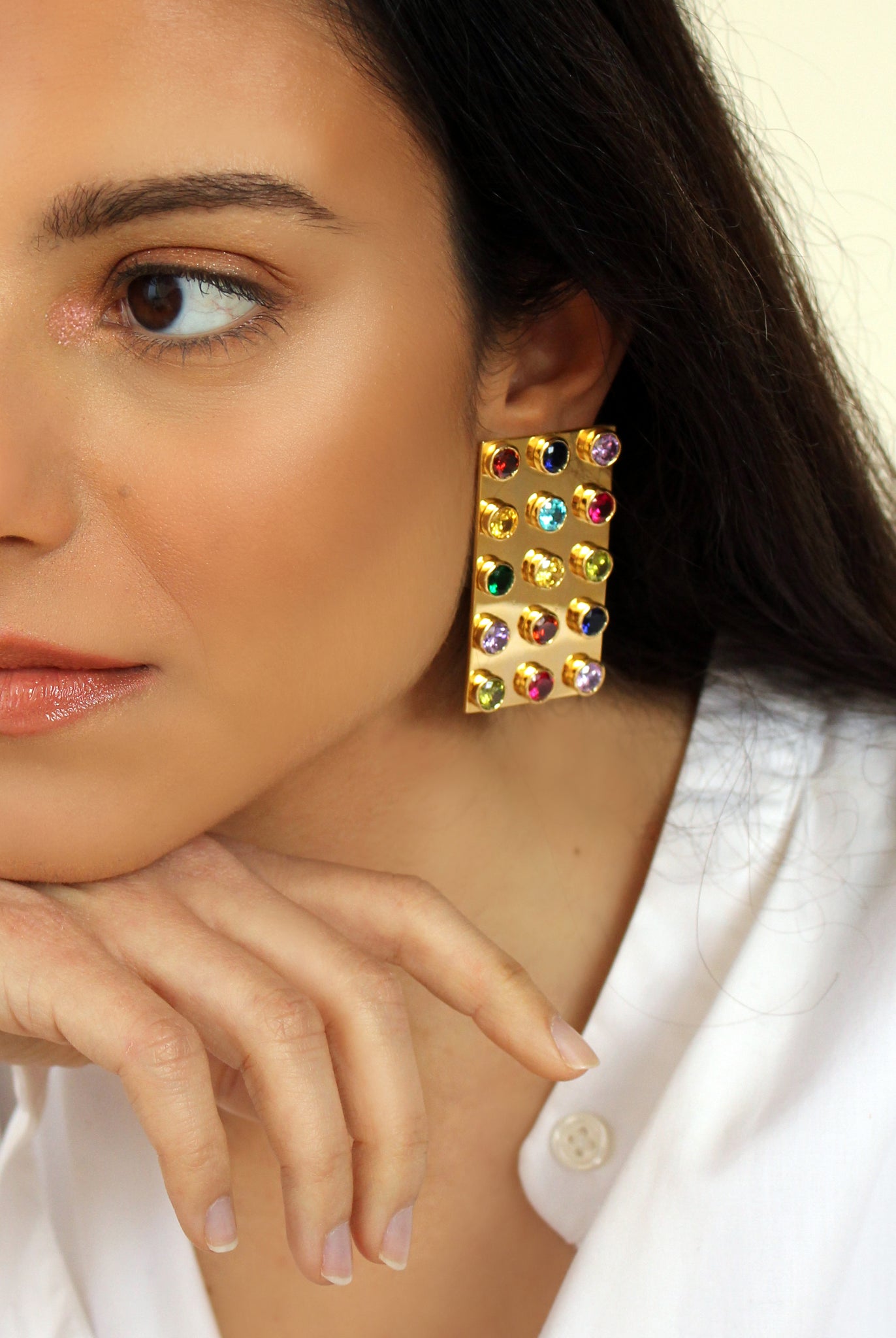 Rectangular, 18 carats gold-plated statement earrings with mirror finish. Copper base.