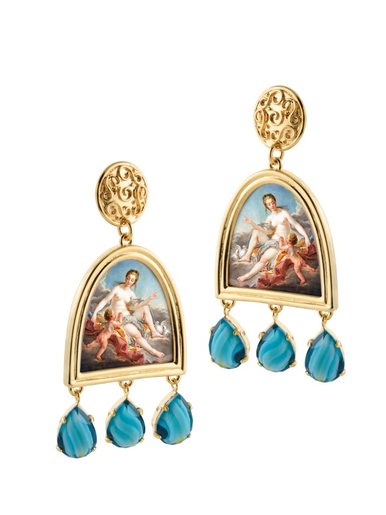 18 carats, gold plated Copper. Wearable mini-tableau, with byzantine icon-inspired frame and dangling blue tear-drop Swarovski stones with painted yellow streaks.